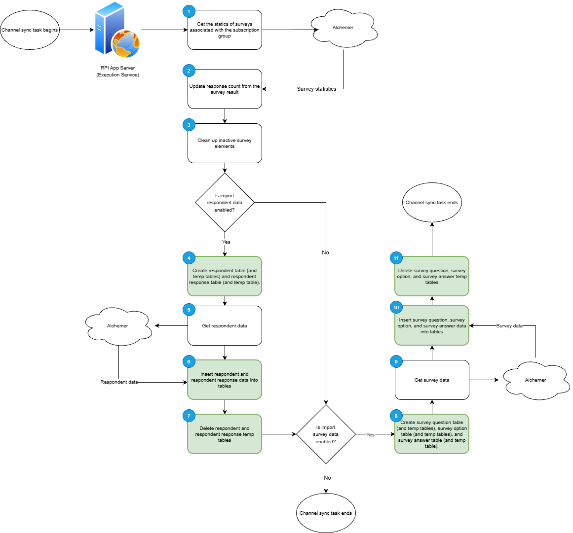 If the Respondent Data Import is enabled in the channel configuration, RPI initiates data ingestion. It first constructs the necessary infrastructure by creating both permanent and temporary tables for Respondents and Respondent Responses. Once these tables are staged, RPI executes a call to fetch the survey response results from Alchemer, populating the temporary tables before merging them into the final respondent database.