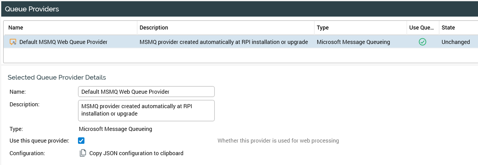 In addition to the System Configuration settings, there needs to be a Queue Provider defined, and it needs to be set at the default. The queue provider that is defined needs to be where the queues that are listed in the system configuration reside. Below is an example of a queue provider configuration.
