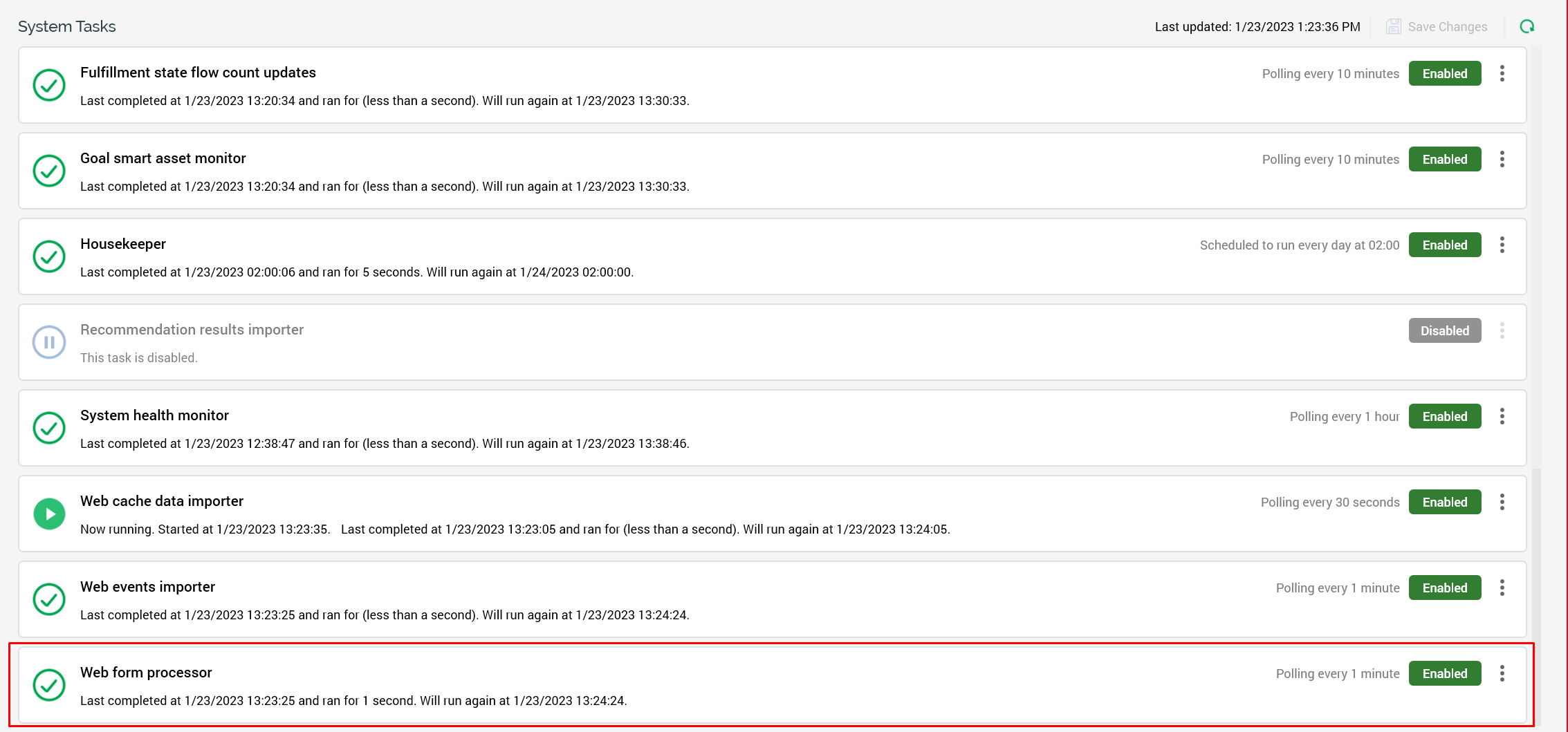 After the configuration is complete, you can enable the System Task "Web form Processor" in RPI Operations within the RPI Client. Currently, the default processing time is set to poll every 10 minutes. This is a setting you can adjust to be more frequent depending on the use case of the form submissions in the particular deployment. In the example above, it is set to execute every minute.