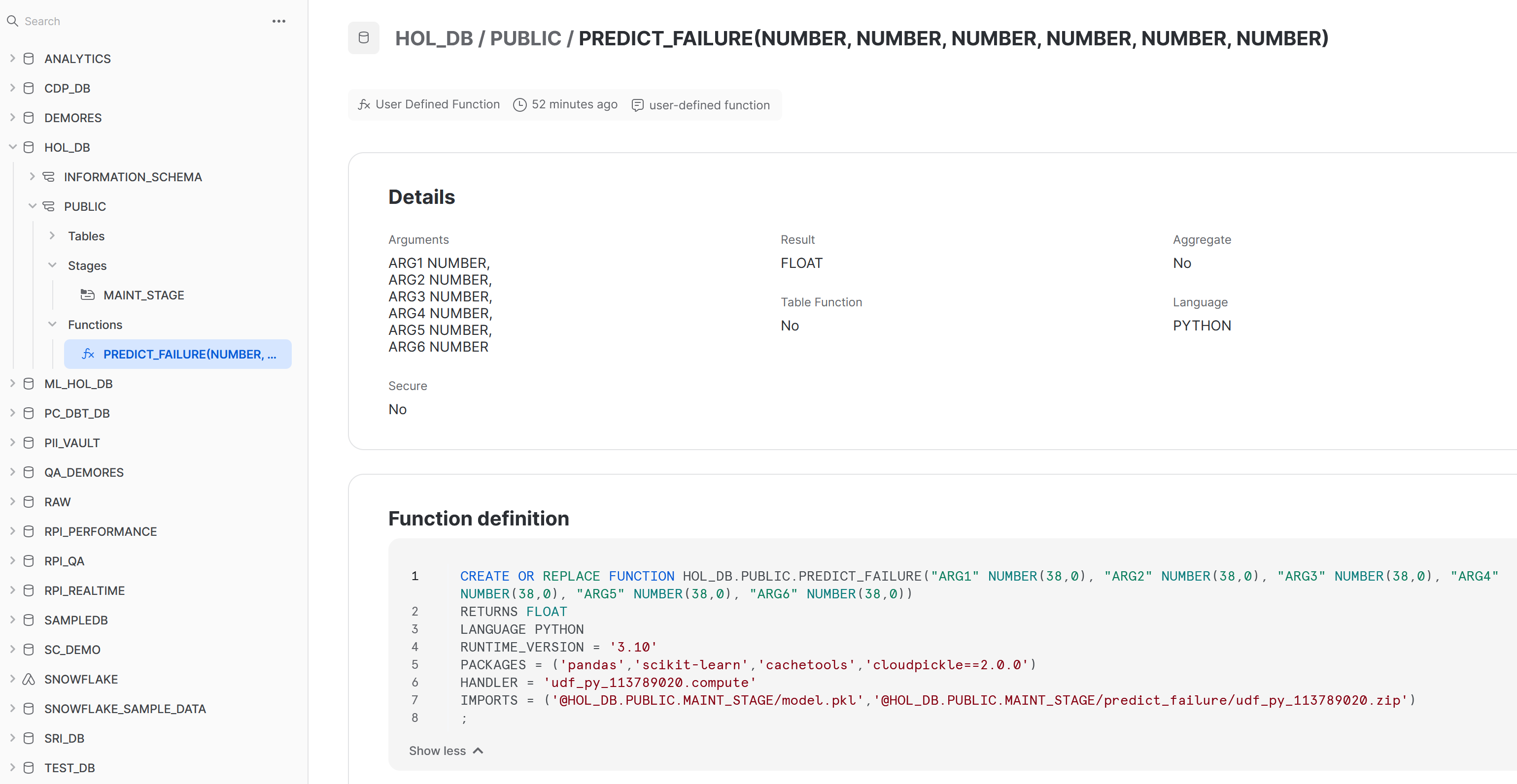 The result of the quickstart exercise is a UDF in Snowflake named PREDICT_FAILURE: