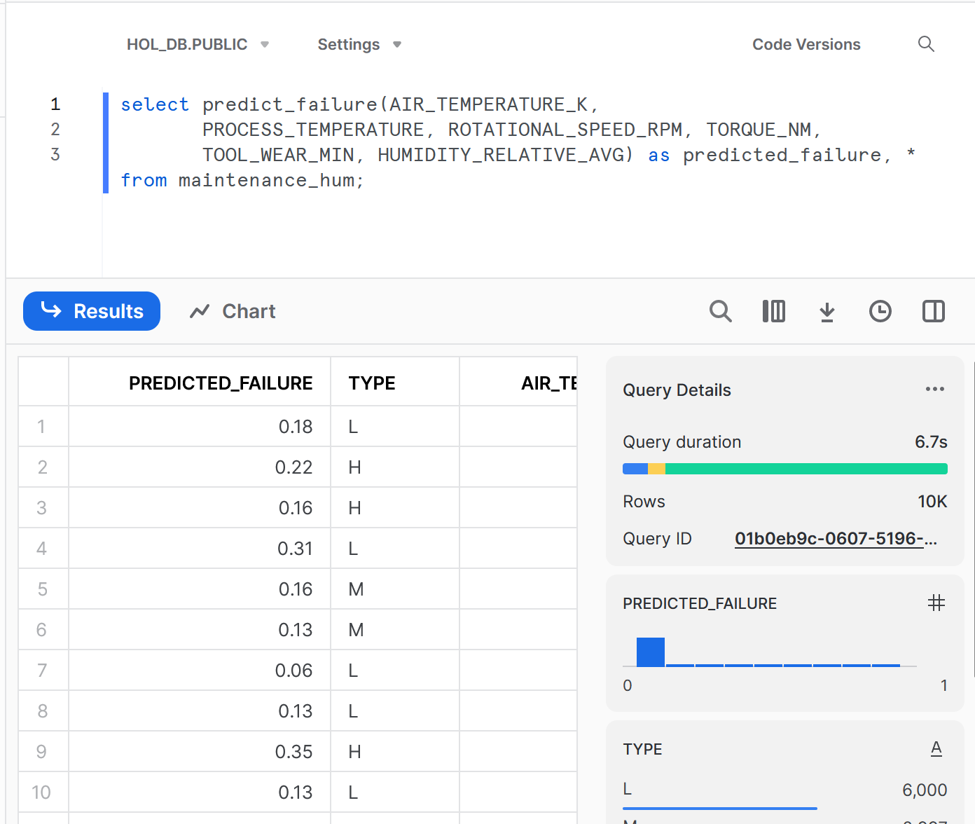 Here we see the execution of the model UDF using SQL in a Snowflake worksheet. Arguments to the UDF come from the table maintenance_hum.
