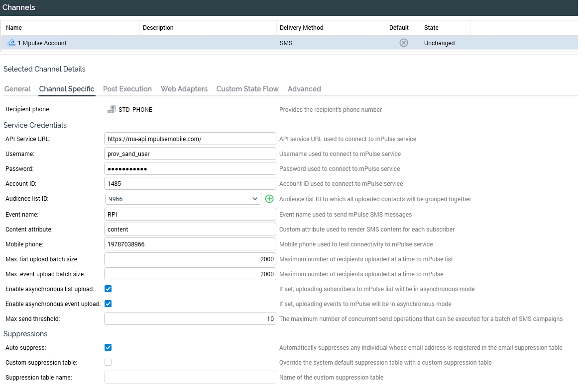 If the channel is configured to auto-suppress unsubscribes, RPI will query the suppression SMS table to identify and suppress any matching phone numbers before generating batch for member records.