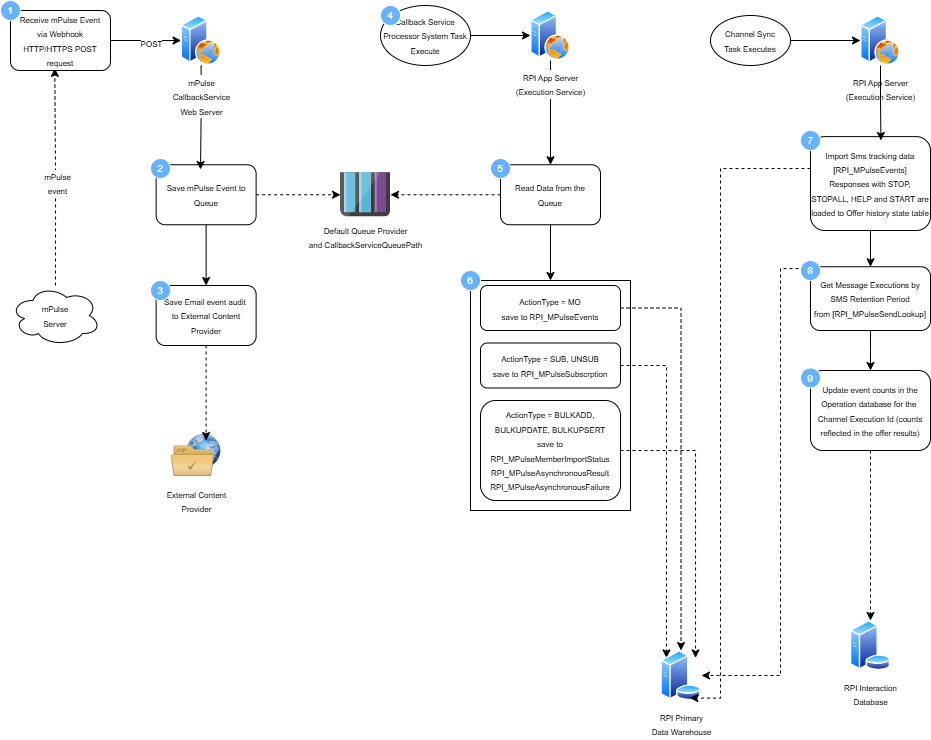 The following flow chart shows how the mPulse channel works within both outbound fulfillment and inbound state synchronization.