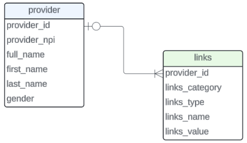 Let’s say that we have a one-to-many (1:M) relationship between provider and links as this high-level entity relationship diagram (ERD) shows.