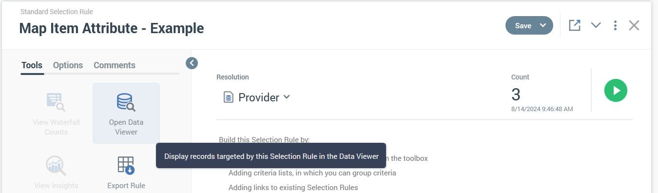 Now that we have created the export template, we can use a selection rule against the provider resolution and then use the data viewer tool with the export template to review the data.