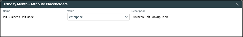 Placeholders: These are attributes that have been created to simplify updating criteria within the selection rules within an audience. This configuration lets you make these changes in one place without needing to go into the underlying audience. Click Manage placeholders to access or change this option any time you use this template. The second screenshot shows that there is only one placeholder for the initial audience, which is looking for Business Unit Code.