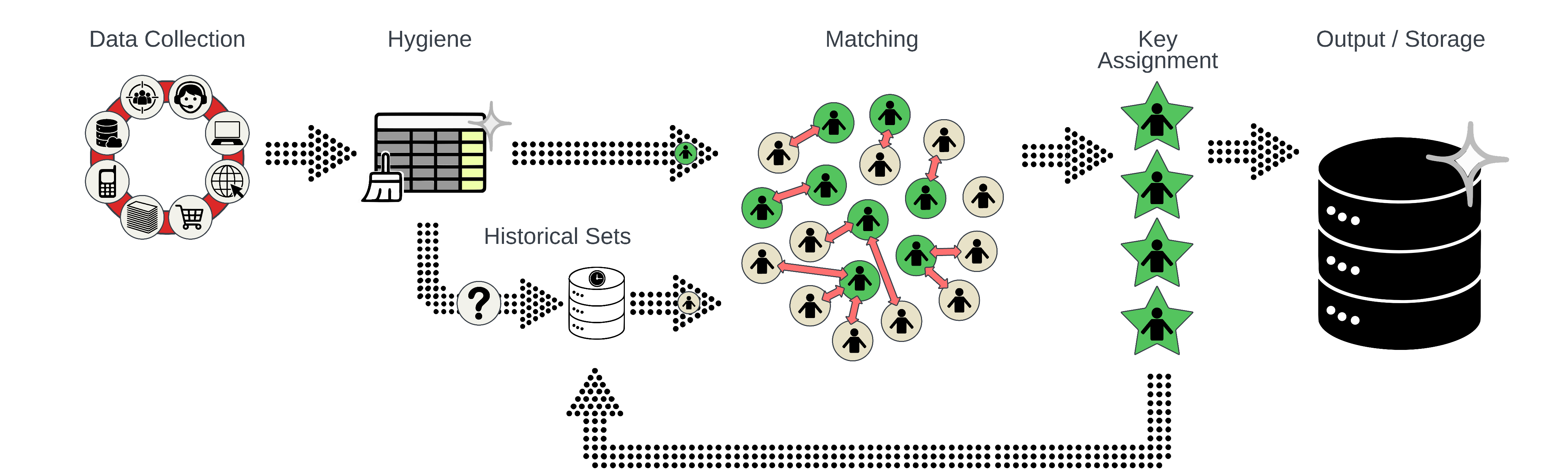 The persistence of match IDs is critical to the IDR process and being able to track the journey an individual/household takes over time. As match groups are formed, a match ID is assigned, and that ID does not change unless data or an event warrants a change to the match group. Match IDs are assigned to all records, regardless of whether they are part of a match group or are a singleton. Match IDs become the master keys representing people, households, or any other matchable entities.