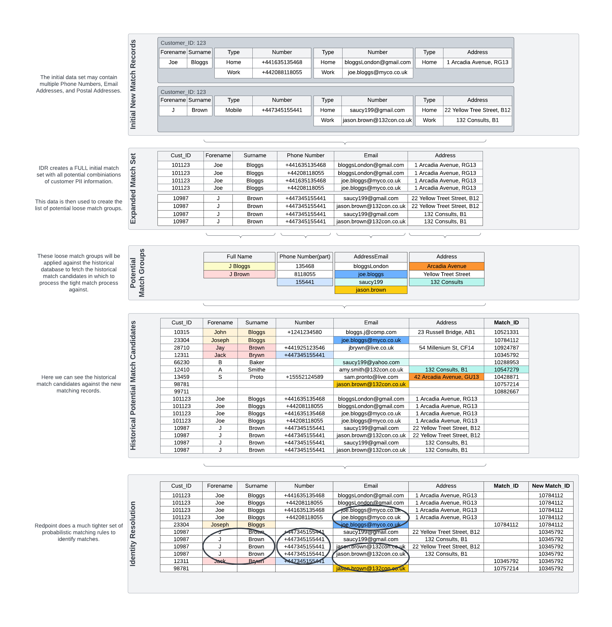 Redpoint’s IDR optimizes the process by utilizing loose groupings to identify match candidates rather than processing incoming records against the entire customer master.