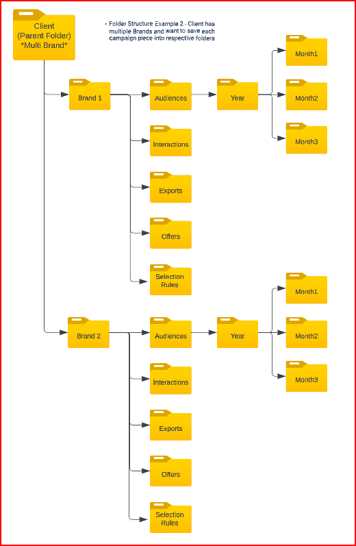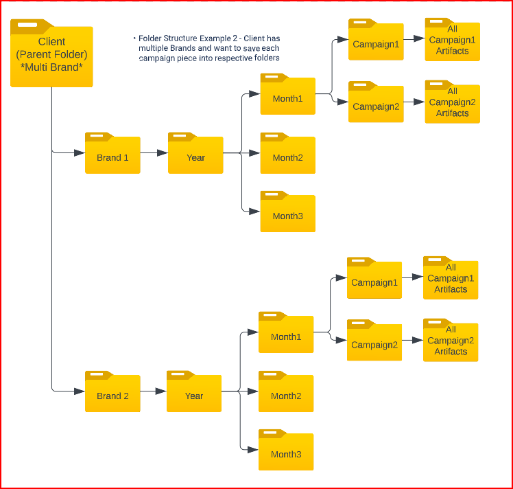 This example shows a client who has multiple brands that are associated to their RPI instance and would prefer to separate them from one another in the folder tree. In the example, there are two separate brand folders followed by the underlying artifacts for the given brand. Clients may choose to move this layout around to account for a given year first and then focus on the brand or potentially roll all of the pieces up to a campaign folder and then the artifacts for that given campaign. See examples below.
