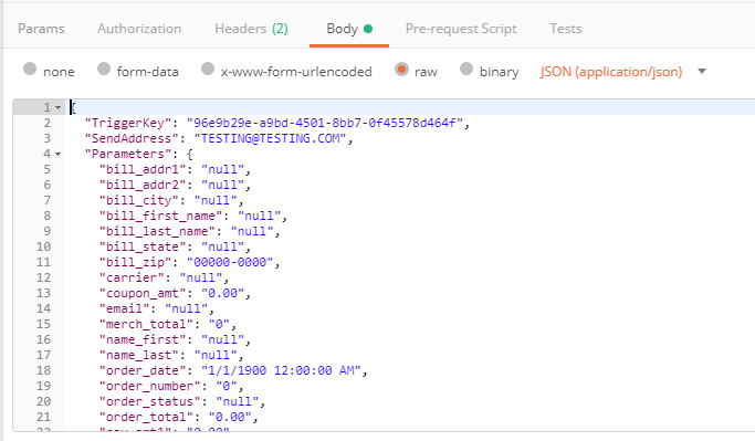 Next under the Body section, paste the above JSON into this section. This will provide the parameters to Postman that will be coming through in the payload.