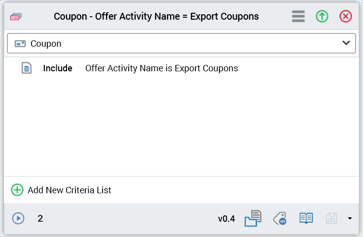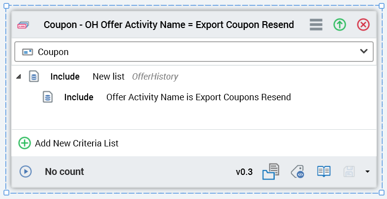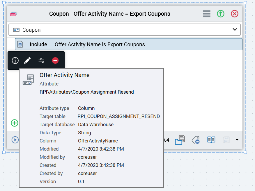 Create a selection rule using the new resolution. We want to select records that are targeted by the previous coupon example, which has an offer activity name of Export Coupons. The offer activity name that should be used to compare is the one that resides on the RPI_Coupon_Assignment_Resend view.