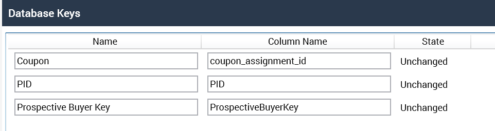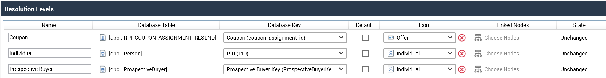 Coupon_Assignmenttable to thePersontable onresolution_key_int01(in this example) toPID.Coupon_Assignmenttable toOfferHistorytable on the same fields that theCoupon_Assignmenttable is configured with; in this example, they areresolution_key_int01toPID,WokflowID, andDataflowID.