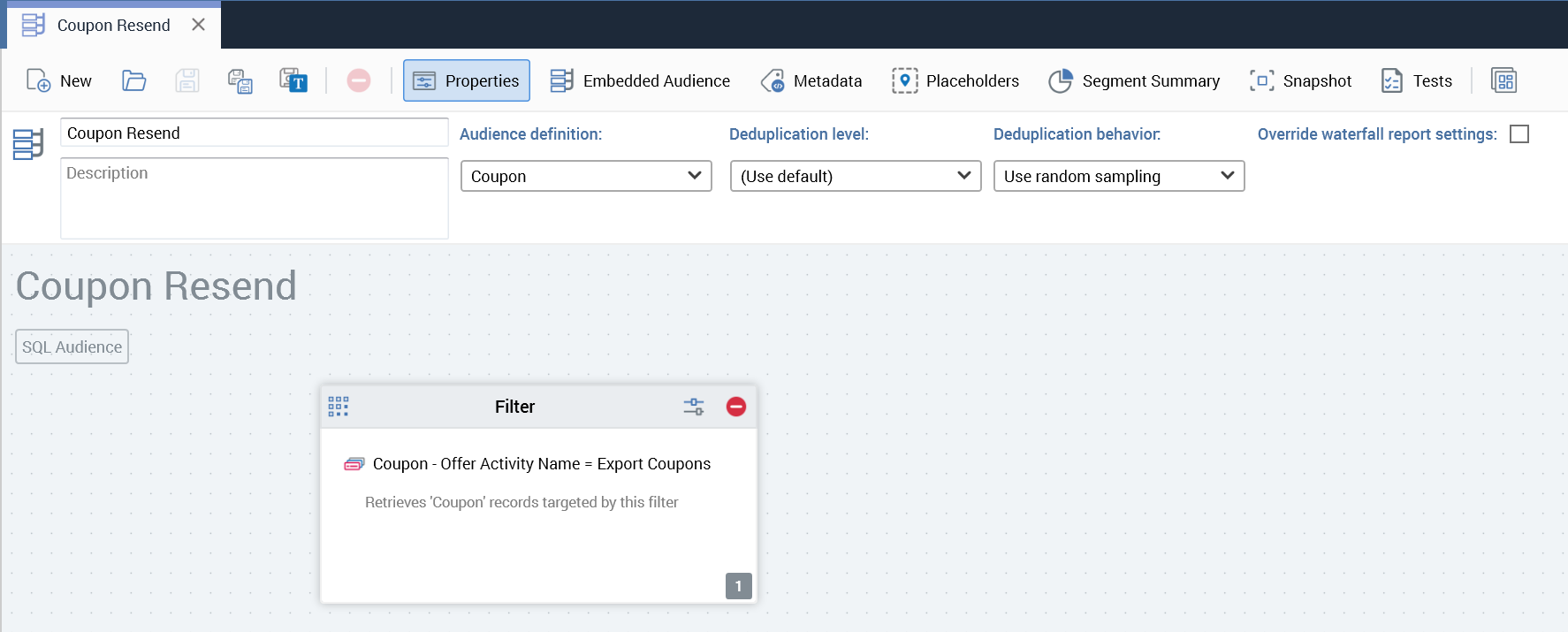 The approach we will use here for resending coupons is to create a new resolution and audience, which we will call Coupon, that allows you to start from the coupon assignment table and work your way out from there. There are a few caveats when doing this: