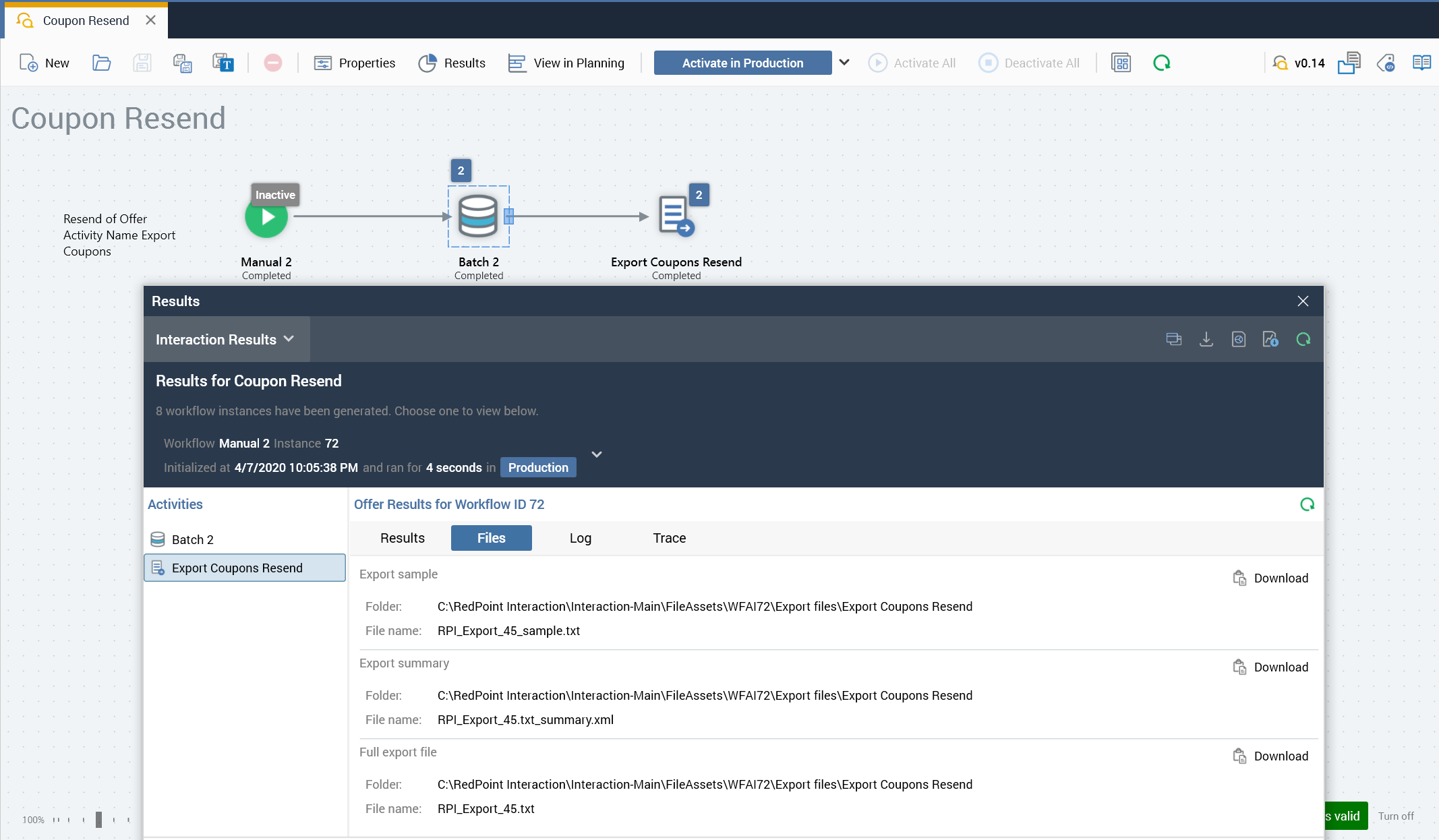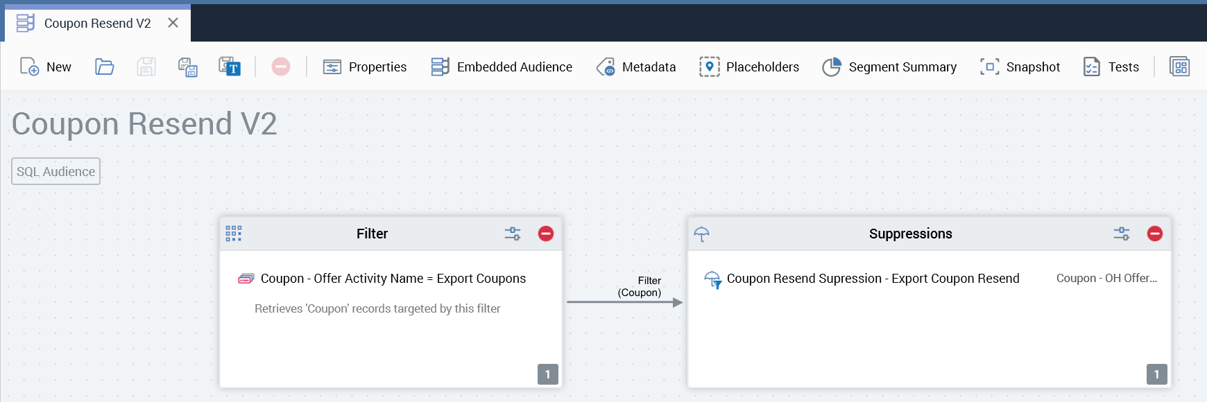 In some cases, we only want to resend a coupon a single time. In order to do that, we apply suppressions as we would in any other interaction. In this section, we will show the simple application of a suppression to allow for only a single resend of a coupon. This also may be used in recurring interactions.