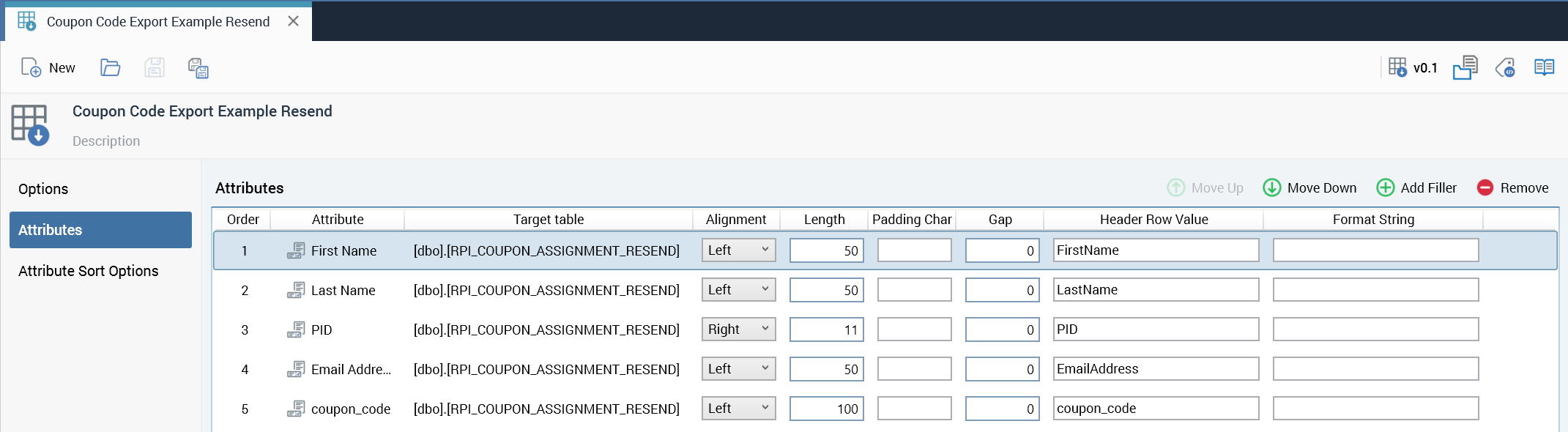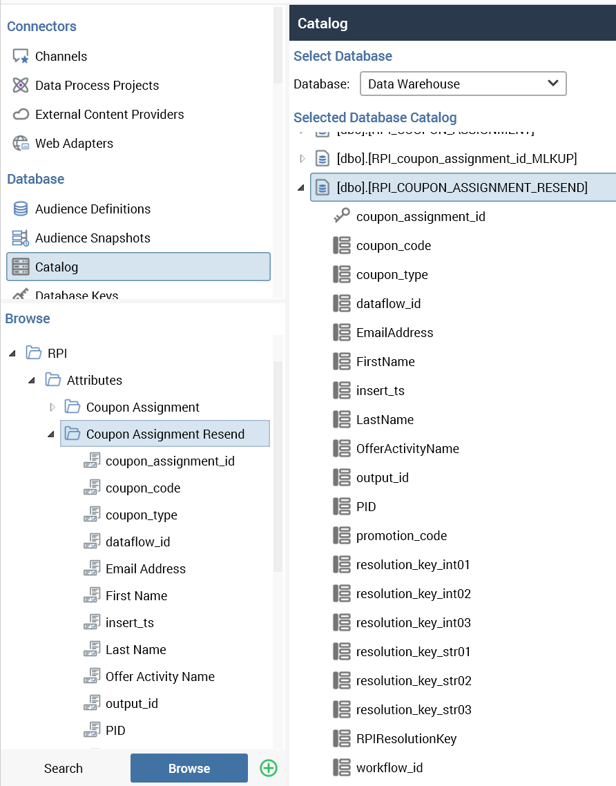 OfferHistorybased on the resolution key of the coupon assignment table, which iscoupon_assignment_id. Given you can only join a table to another table one way in RPI we will need to create a view of the coupon assignment table with a slightly different name; in our example, it will be namedRPI_Coupon_Assignment_Resend.To ensure that the fulfillment activity targets the right data, we need to include some additional fields in this view to simplify the process and minimize the joins defined within RPI, which may introduce unanticipated data or results.