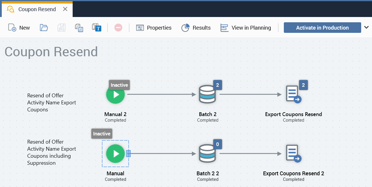 This is an example of how a coupon resend process could be configured, but the implementation depends on how you intend to use the resend process. This approach should be tested to ensure it meets your specific needs. Additionally, this example is only using a single resolution, but can be extended to support multiple resolutions.