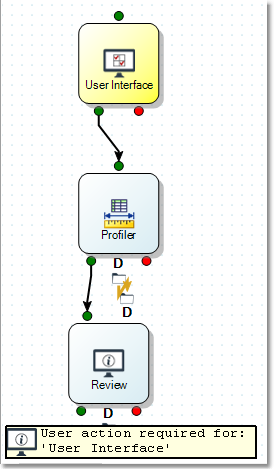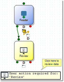 When an automation triggers a Review step, the data is pre-processed, and then the Data Management client waits for user intervention before proceeding. If you have the automation open in the Data Management client, you will see the review step turn yellow. A box at the bottom indicates that action is required.