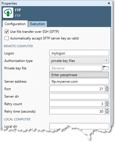 You can optionally enable SSH File Transfer Protocol (also called SFTP or Secure FTP), a secure file transfer protocol that takes place over the secure shell (SSH). When you specify SFTP, you can choose to automatically accept the SFTP server's secure key and save it to the repository as a trusted server. If you do not enable this option, at runtime the automation will require user input.