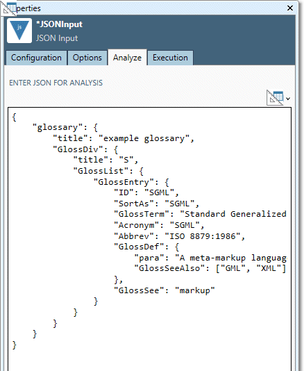 The JSON Input tool has two sets of configuration parameters in addition to the standard execution options.