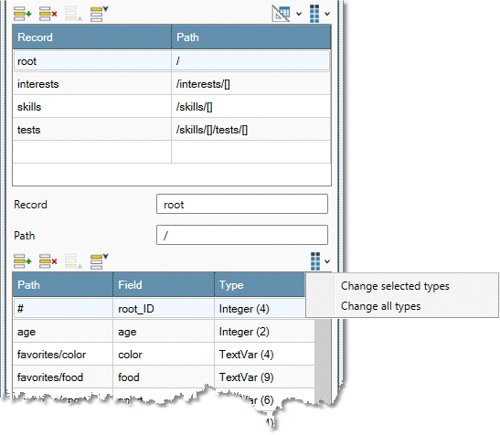 On the Configuration tab, select each cell in the Record column, and examine the Fields grid to verify that the schema is correct and the data is accurately described (see About JSON paths for details). If a field type is incorrect, select the cell in the Type column, and specify the field's data type and size. You can also use the Change selected types and Change all types commands on the