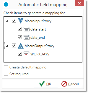 On the Automatic field mapping window, select the items to map. If the output schema is the same as the input, automatic field mapping may be unavailable for the Macro Output tool.
