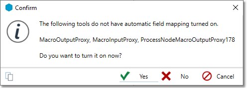 If you have not already enabled automatic field mapping on the Macro Input and Macro Output tool's properties, you will be asked to confirm.