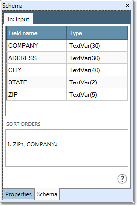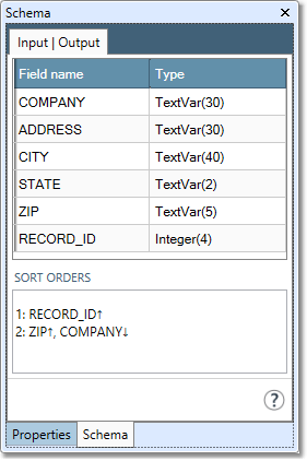 When you select a connector, the Schema pane shows the fields and record orders of the data passing through the connector. For example, the output connection of a Sort tool that has sorted data by ZIP (ascending) and COMPANY (descending) shows the following schema.