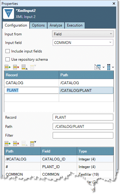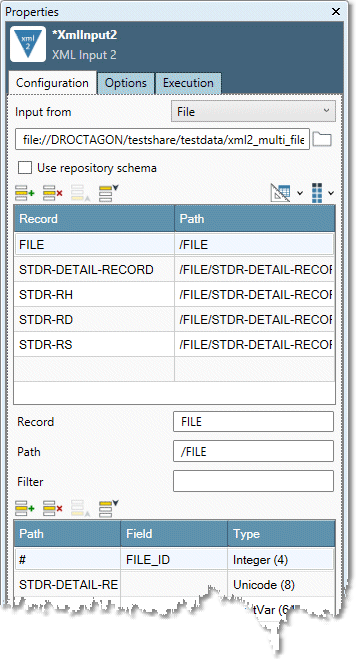 The XML Input2 tool has two sets of configuration parameters in addition to the standard execution options.