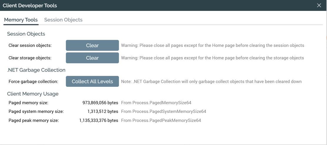 Developer Tools: selecting this option displays the Client Developer Tools dialog, with its Memory Tools and Session Objects tabs. The Memory Tools tab contains the following: