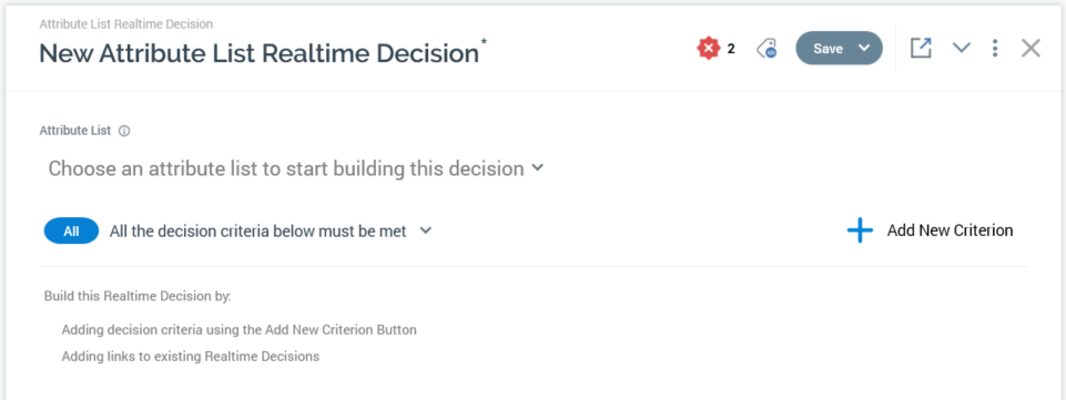 Attribute list: you must select an attribute list from a dropdown, which exposes all non-placeholder attribute lists configured at the current client. Having done so, you can create and configure decision criteria based on the attributes within the selected list.