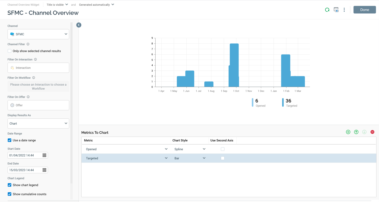 One series is displayed per configured metric, reflecting the current configuration settings (Channel, Filter on all/specific, Interaction, Workflow, Offer, Date Range/Show last [n] days, Show legend, and Chart palette).
