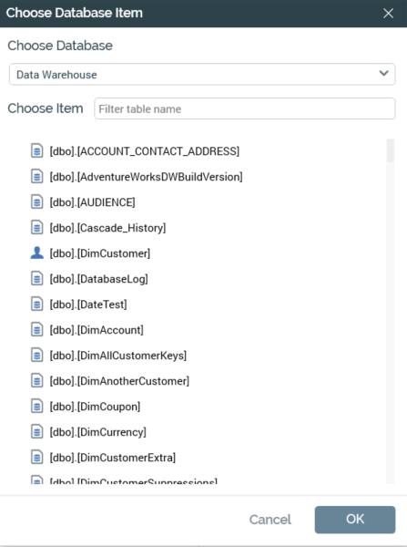 To choose a table or column, select it and select OK. You can also close the dialog without making a selection by choosing Cancel.