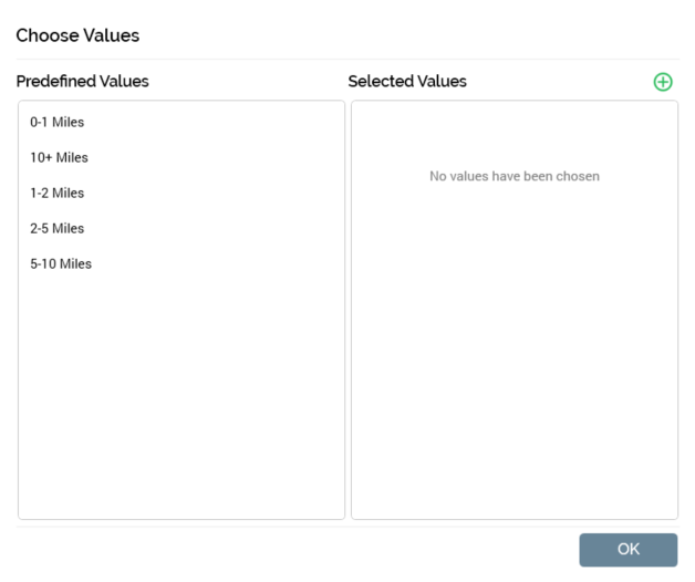 The Choose Values dialog is available when a criterion supports the selection of a value provided by RPI: