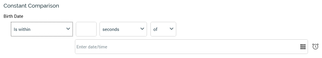 When creating a constant comparison criterion in respect of a date/time attribute, an extra operator value (is within) is made available. The following fields are shown if it is selected: