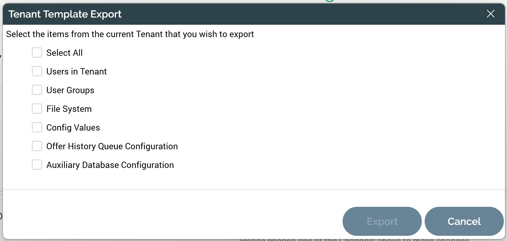 This button is displayed at all configuration interfaces. It allows you to export items from the current tenant to use as a template for other Tenants. Access is protected by the 'Configuration - Tenant Templates' functional permission. Selecting the button displays the Tenant Template Export modal dialog.