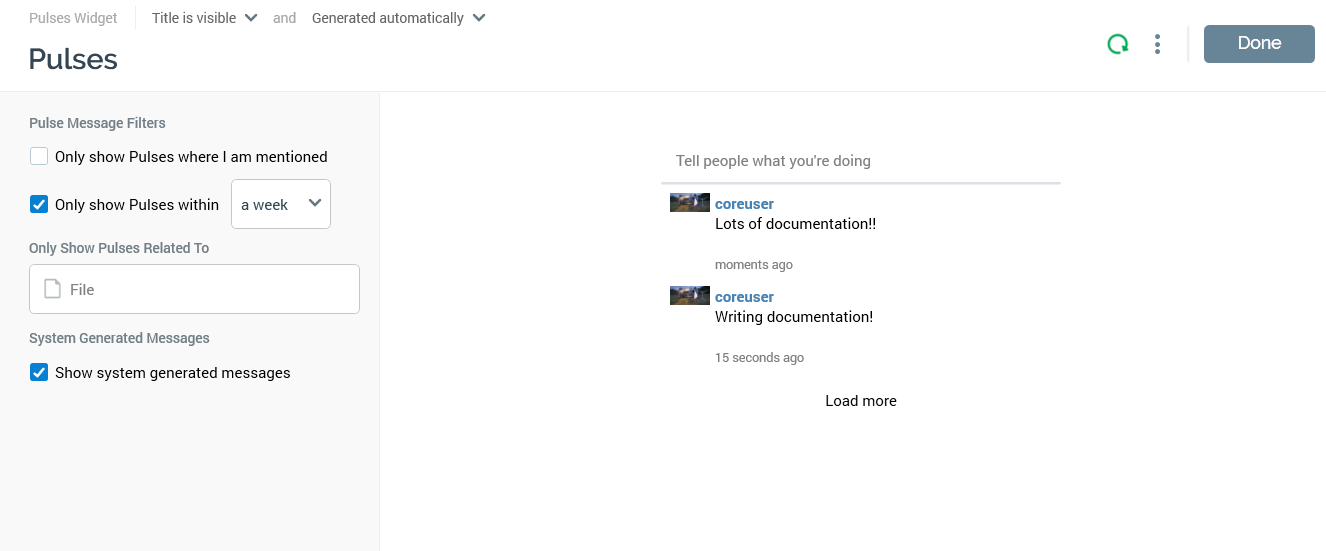By default, 20 pulses are displayed in the pulses list. You can invoke Load more to view additional pulses. This button is displayed after the final message in the list. Selecting the button adds an additional 20 pulses to the list. Pulses continue to be displayed in reverse chronological order, with the oldest pulses at the bottom of the list. More pulses are always loaded in accordance with your current filter settings. Subsequent invocation adds 20 older pulses to the bottom of the list. The maximum number of pulses displayable within the pulses list is defined by system configuration setting MaxPulsesInList.