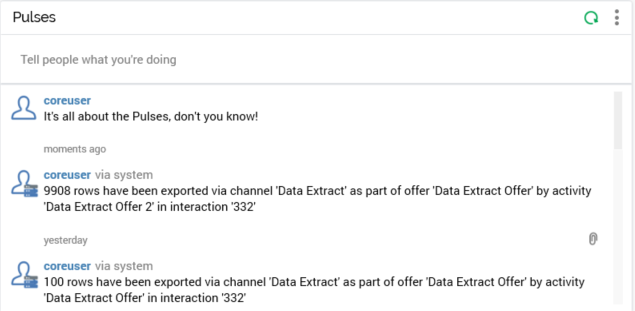 Pulses are also generated automatically by the system upon the occurrence of significant events; in addition, when such an event occurs in respect of a file, a link is created between that file and the pulse (note that you can also add attachments to a pulse manually).