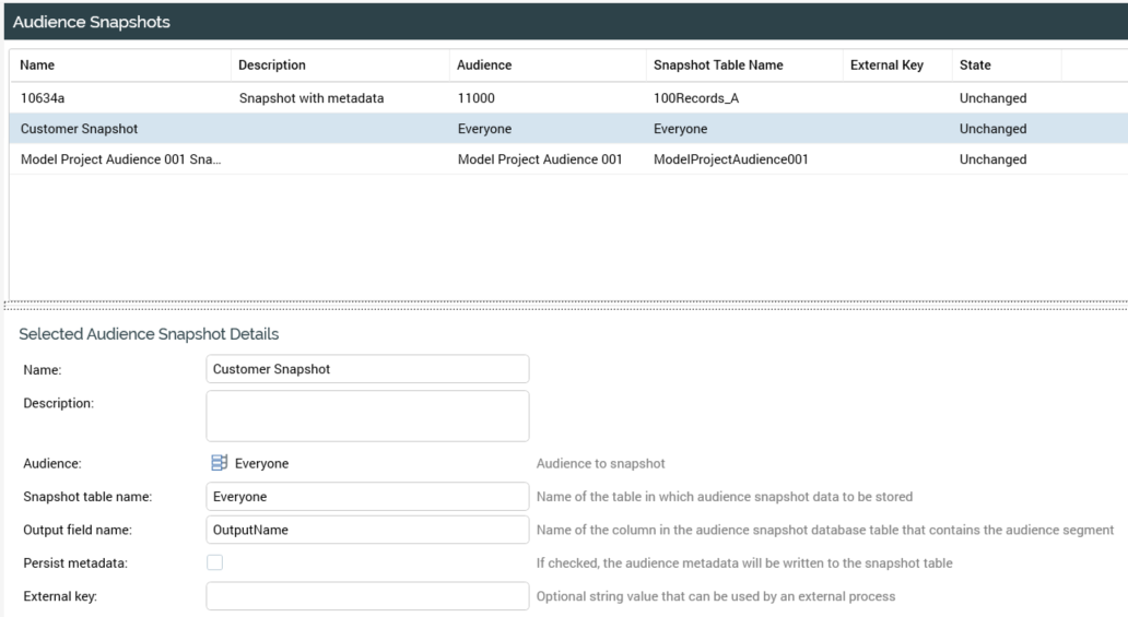 Definition of audience snapshots is carried out in the Audience Snapshots configuration interface.