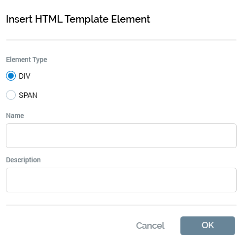 Selecting the button displays the Insert HTML Template Element dialog.