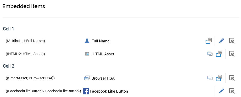 If shown for HTML email offer or landing page content, embedded items are grouped by cell. If a cell is shared, its share name is displayed; if not, its ordinal cell number is shown. Cells are ordered as per their appearance within the Page Layout section. Any items included in a cell more than once are displayed once only in that cell.