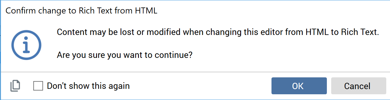 Selecting this button switches the current content editor into rich text mode. Upon invocation, a dialog is displayed: