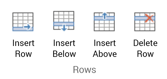 The Layout tab’s Rows section exposes the following commands: