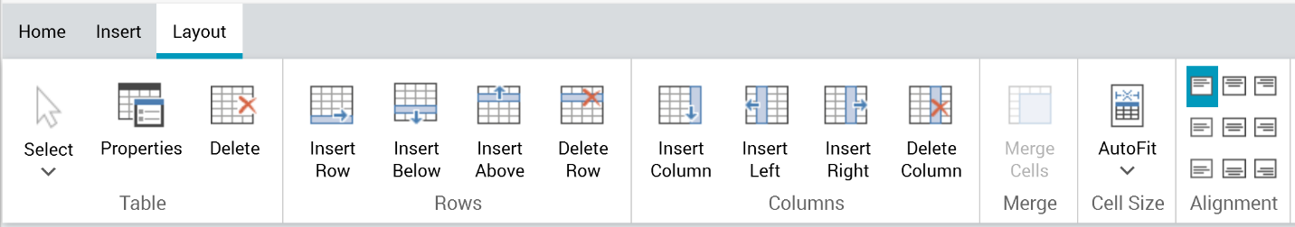The Layout tab’s Table section exposes the following commands:
