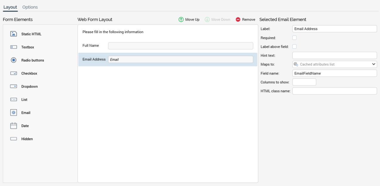 The layout tab allows you to drag form elements from the top section of the toolbox, and drop them into a form elements list to construct your web form.