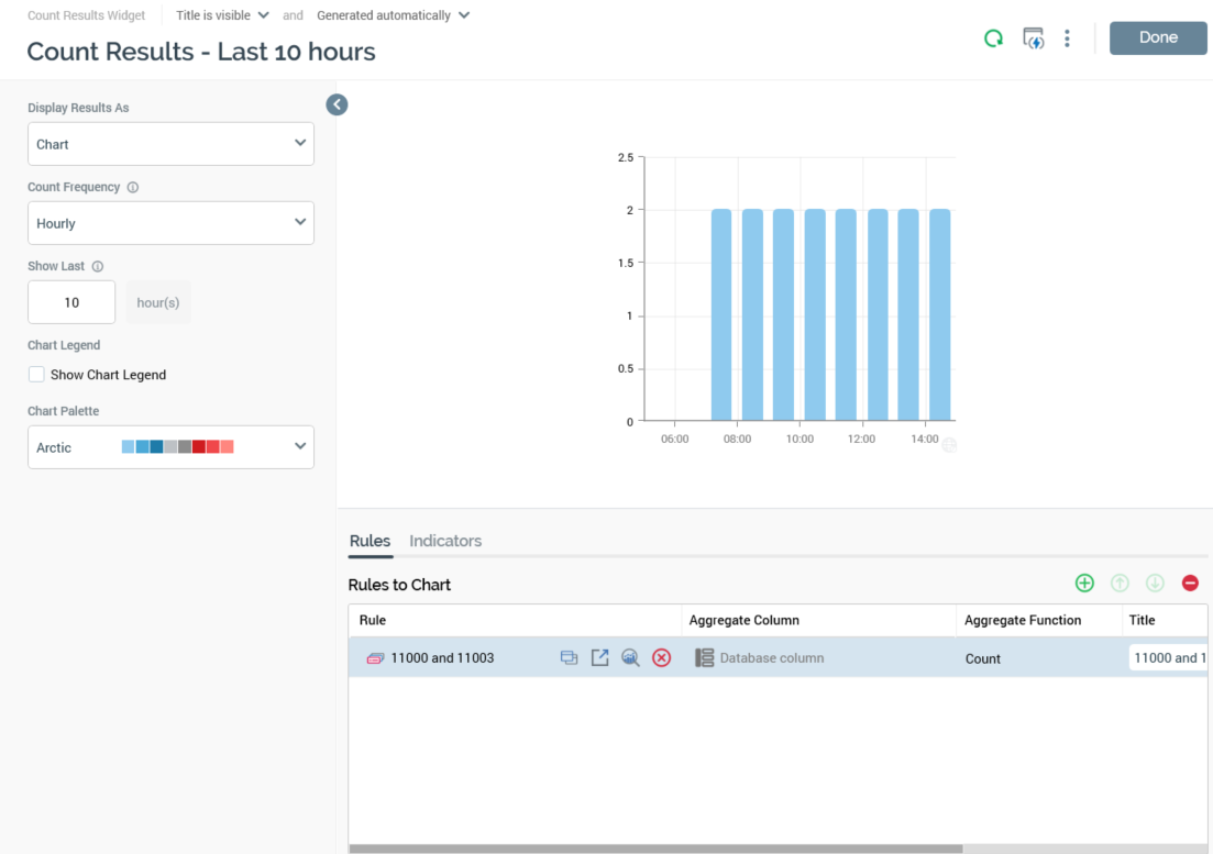 The widget's chart displays one series per configured rule, reflecting the current configuration settings (Frequency (note that only available results are displayed), Show last, Show chart legend, Chart palette and selection rule).