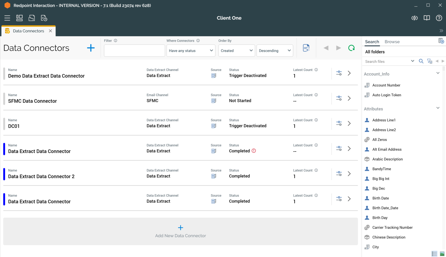 Data Connectors allow you to transfer data, on a repeating basis, to a third party. Data connectors provide a simpler way to effect data integration without the unnecessary overhead inherent in performing this task using an interaction.