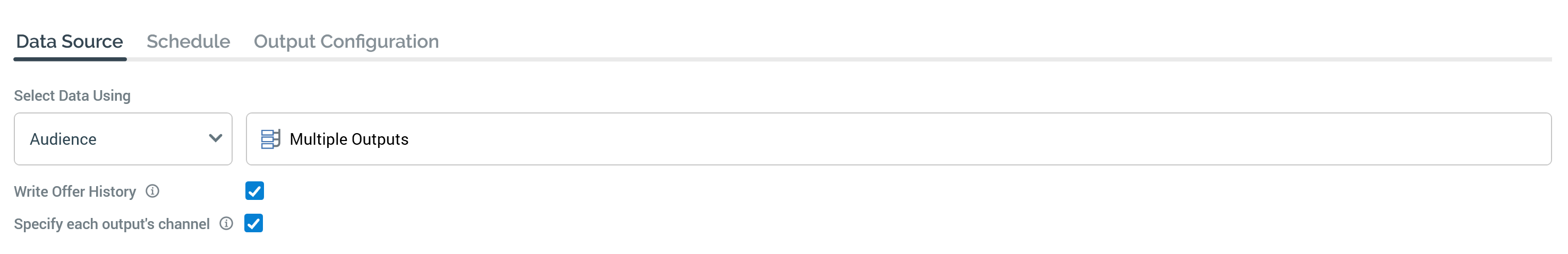 Specify each output's channel: this option is shown if the selected audience has multiple outputs. If the property is unchecked, the Channel Configuration tab is shown. If checked, it is replaced with the Output Configuration tab. An information tooltip accompanies the property stating “if checked, each output can be configured with a separate channel. If unchecked, all outputs will use the same channel”.
