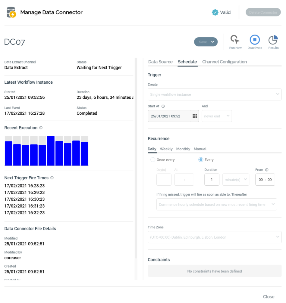 Deactivate: this button is displayed when a data connector's Status is Waiting for Trigger. It ceases activity within the data connector, and sets its Status to Trigger Deactivated.