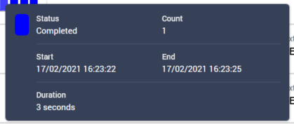 Recent Execution: a bar chart shows the relative durations of up to 10 of the most recent instances of the connector's execution. An information tooltip is shown on hovering over a bar: