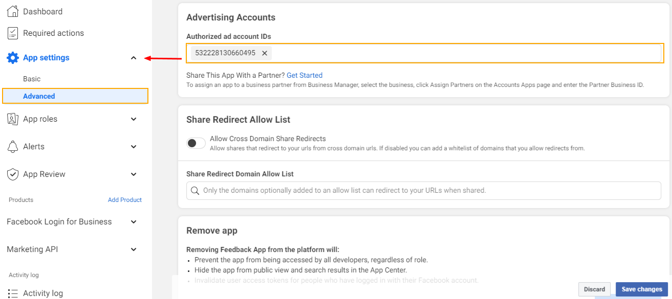 Locate the Advertising Accounts section, and add the Ad Account ID(s) you want to use to promote your app.